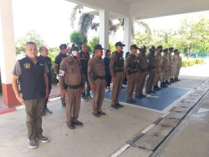 พ.ต.ท.ชนะ ธีรศรัณยานนท์ , พ.ต.ท.รุ่งเรือง แสนโครต , พ.ต.ต.ธีระวุทธิ์ หล้าทุม พร้อมกำลังเจ้าหน้าตำรวจ สภ.บางซ้าย ร่วมปล่อยแถวระดมกวาดล้าง ผู้มีอิทธิพล และอาชญากรรม หน้าที่ว่าการอำเภอบางซ้าย