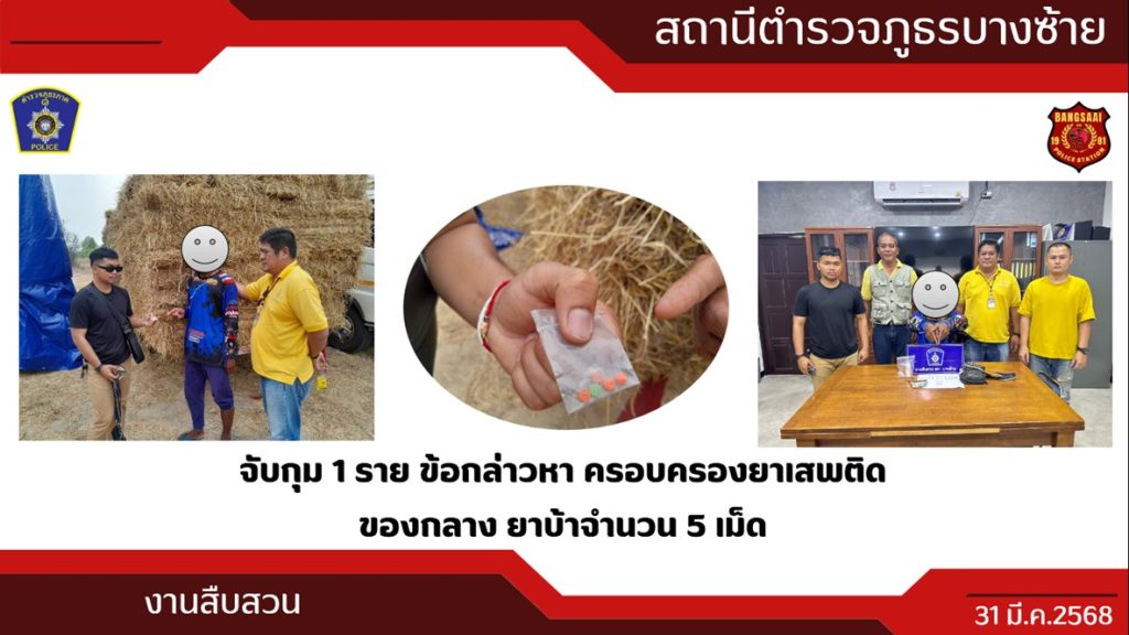 วันที่ 31 มี.ค.68 พ.ต.ท.อติคุณ กลิ่นหวล รอง ผกก.สส.สภ.บางซ้าย ,พ.ต.ท.ปภินวิช มีชีพสม สว.สส.ฯ ,ด.ต.ประยูล สยามล ผบ.หมู่ (ป.)ฯ, จ.ส.ต.ศุภเสฎฐ์ อาภรณ์พงษ์ ผบ.หมู่(ป.)ฯ,ส.ต.ต.ชนาธิป เกษามา ,ส.ต.ต.อภิวัฒน์ อรรคบุตร ร่วมกันจับกุมนายวีรยุทธ กวกขุนทด อายุ 32 ปี อยู่บ้านเลขที่ 207/1 ม.15 ต.วังไทร อ.ปากช่อง จ.นครราชสีมา ข้อกล่าวหา ครอบครองยาเสพติดของกลาง ยาบ้า จำนวน 5 เม็ดสถานที่จับกุม กองฟางริมถนน ม.7 ต.ปลายกลัด อ.บางซ้าย จ.พระนครศรีอยุธยา นำตัวผู้ต้องหา ส่ง สภ.บางซ้าย เพื่อดำเนินการต่อไป