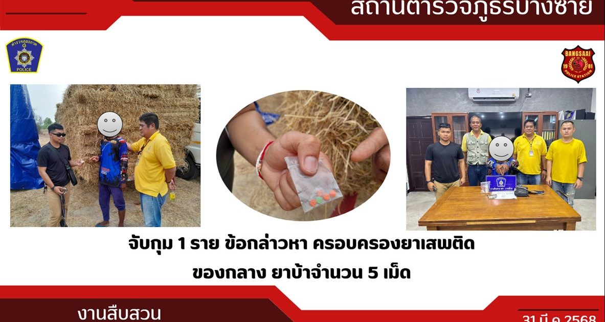 วันที่ 31 มี.ค.68 พ.ต.ท.อติคุณ กลิ่นหวล รอง ผกก.สส.สภ.บางซ้าย ,พ.ต.ท.ปภินวิช มีชีพสม สว.สส.ฯ ,ด.ต.ประยูล สยามล ผบ.หมู่ (ป.)ฯ, จ.ส.ต.ศุภเสฎฐ์ อาภรณ์พงษ์ ผบ.หมู่(ป.)ฯ,ส.ต.ต.ชนาธิป เกษามา ,ส.ต.ต.อภิวัฒน์ อรรคบุตร ร่วมกันจับกุมนายวีรยุทธ กวกขุนทด อายุ 32 ปี อยู่บ้านเลขที่ 207/1 ม.15 ต.วังไทร อ.ปากช่อง จ.นครราชสีมา ข้อกล่าวหา ครอบครองยาเสพติดของกลาง ยาบ้า จำนวน 5 เม็ดสถานที่จับกุม กองฟางริมถนน ม.7 ต.ปลายกลัด อ.บางซ้าย จ.พระนครศรีอยุธยา นำตัวผู้ต้องหา ส่ง สภ.บางซ้าย เพื่อดำเนินการต่อไป